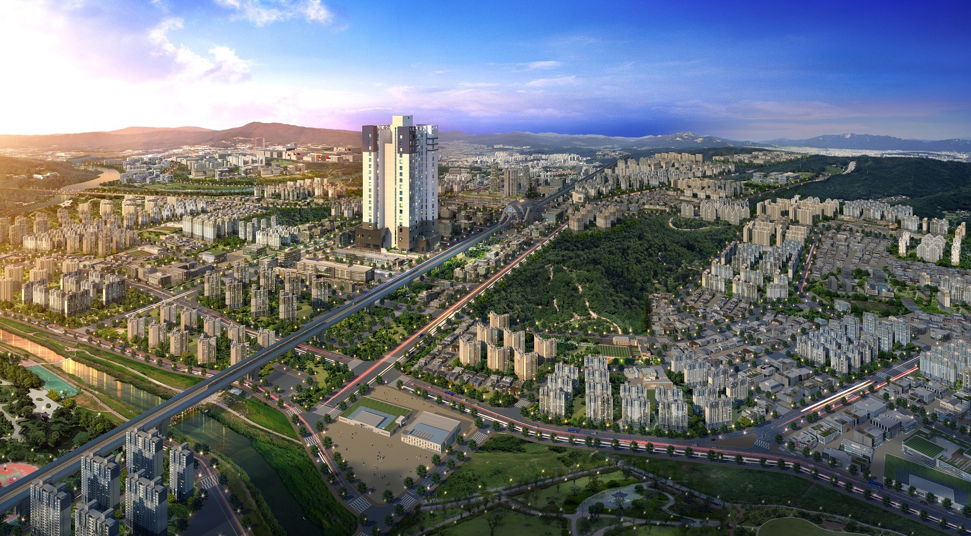 교통 접근성과 자연환경이 조화된 장점을 강조해야 했습니다. 본 조감도는 항공 시점을 통해 지역 전체 스케일을 보여주며,